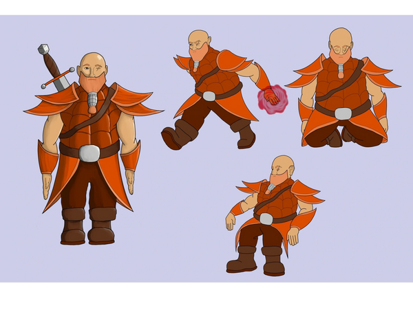 Character illustration and design exercise of a fantasy dwarf. One neutral standing pose and three action poses. Done in Photoshop.